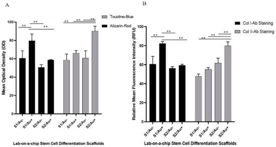 Effect of substrate composition (stiffness and presence of AuNW) on the differentiation of hAMSCs to osteo/chondrogenic fate characterized by (A) alizarin red and toluidine blue staining and (B) immunohistochemical staining. hAMSCs were differentiated on microfluidic channels containing fibrin scaffolds of varying stiffness with and without AuNW. The relative mean fluorescence intensity (RFU) was applied to characterize the expression of cell surface markers (antibody staining) of osteo/chondrogenic. The mean optical density was used to characterize the calcification and proteoglycans formation. S1/Au+ is a low concentration of fibrin components with AuNWs, and S1/Au− is a low concentration of fibrin components without AuNWs. S2/Au+ is a high concentration of fibrin components with AuNWs, and S2/Au− is a low concentration of fibrin components without AuNWs. ** Significant difference between the two groups (p < 0.01).