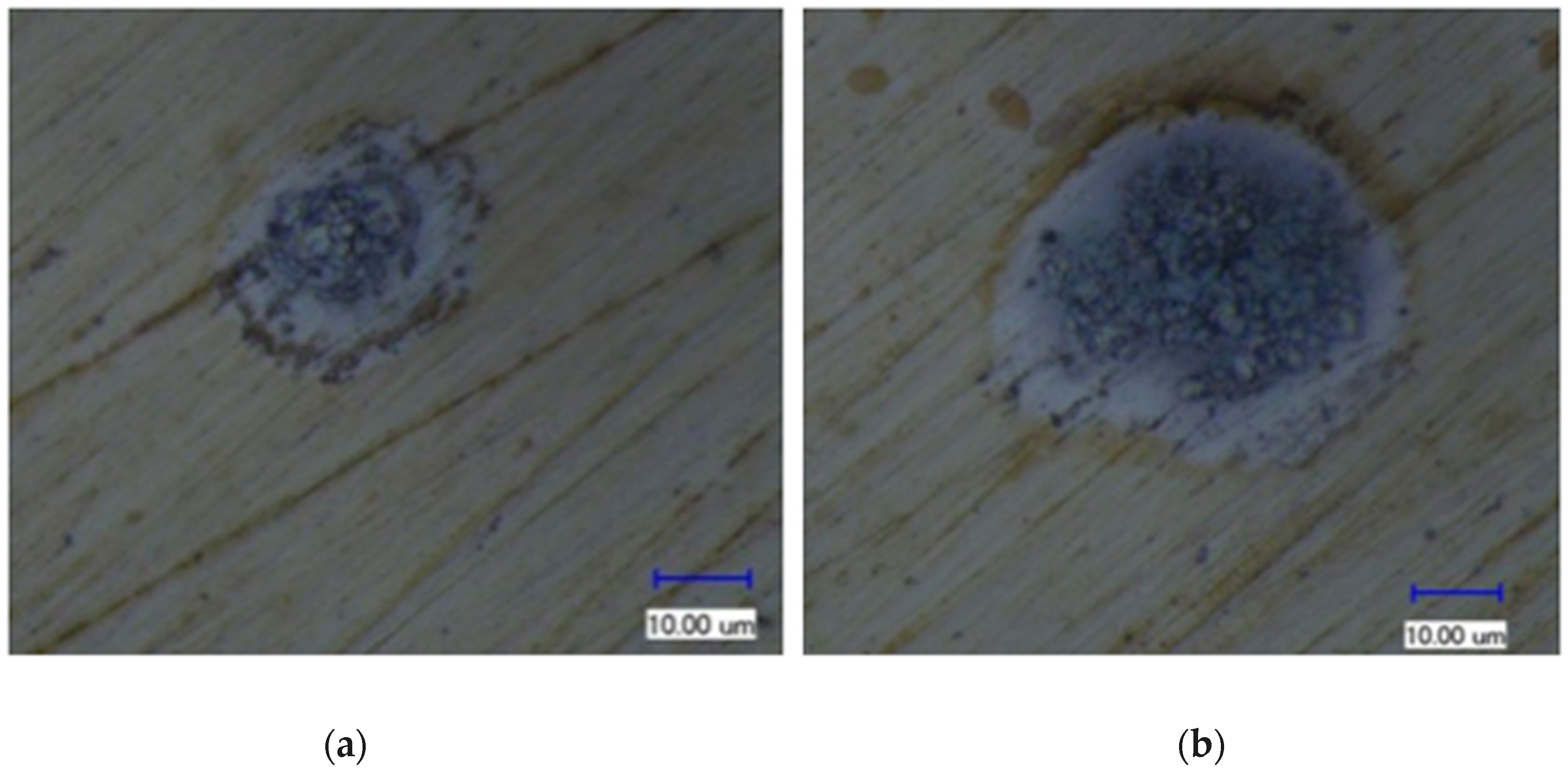 3.2. Effect of Actual Discharge Duration on the Radius of a Discharge Crater