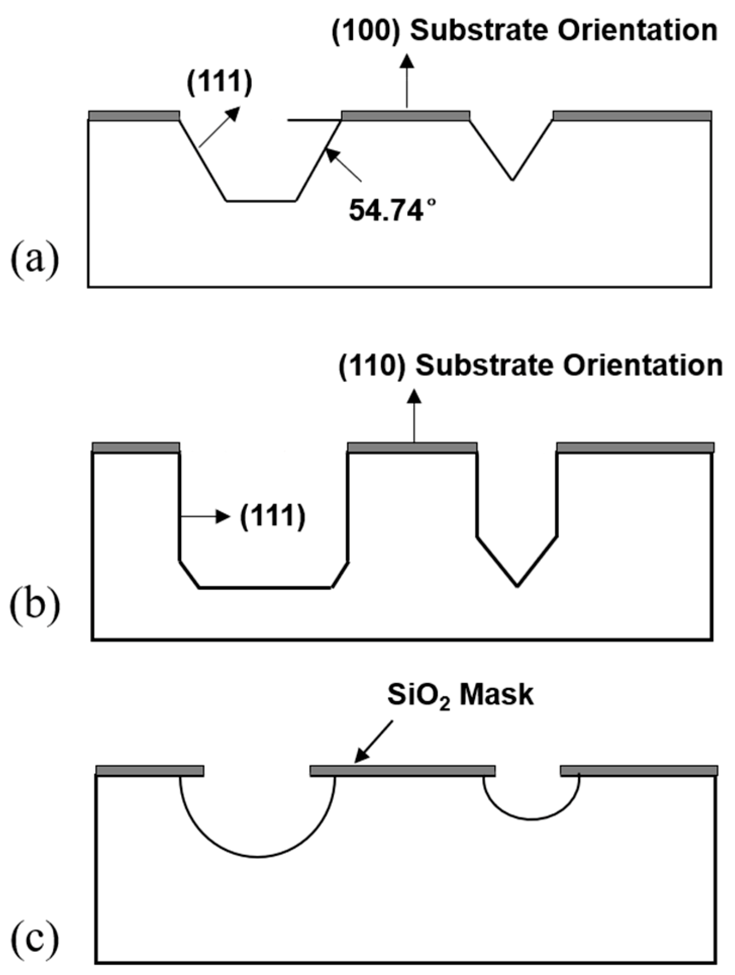 - Bean, K. Anisotropic etching of silicon. IEEE Trans. Electron Devices 1978, 25, 1185–1193. [Google Scholar] [CrossRef]