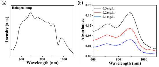When measuring the phosphate in water, the phosphate is usually converted into PMo heteropoly blue by the chromogenic reaction, which has a strong characteristic absorption peak at about 890 nm [5]. First, the light source used for the detection is calibrated and measured by spectrometer. Its spectrum is shown in Figure 2a with a broadband wavelength range of 600–900 nm and spanned the characteristic absorption peak of PMo heteropoly blue [16]. The power of the equilibrium halogen lamp is 10 W and the output optical power of pigtail is about 17 µW and the variation of light intensity was measured to less than 2% in 1 h.