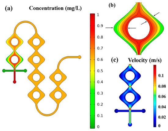 In order to demonstrate the effective mixing of fluids in the microreactor, COMSOL Multiphysics® (5.4, COMSOL, Inc., Stockholm, Sweden) was employed to simulate and obtain the flow in the micromixer. During the mixing process, we set the initial velocity at the inlet as 0.083 m/s (50 µL/min) and 0.025 m/s (15 µL/min). As shown in Figure 3a, the main microchannel was first divided into two sub-channels and then reconfigured at periodic intervals along the length of the microchannel. The sub-channels were provided with sinusoidally varying convergent–divergent walls. The outer wall and the center circle exert centripetal and centrifugal forces on the liquid as it flows through it, which caused more distortion of concentration lamina and faster mixing at various cross-sectional planes of the microchannel, as shown in Figure 3b [13,14]. The microflow was also accelerated at the throat of each converging–diverging cell to further improve the performance of the micromixer as in Figure 3c. Moreover, it was found that the mixing was nearly completed when flowing into the second cell. Therefore, the design of convergent–divergent wall could ensure the thoroughly mix and chromogenic reaction before the optical detection.