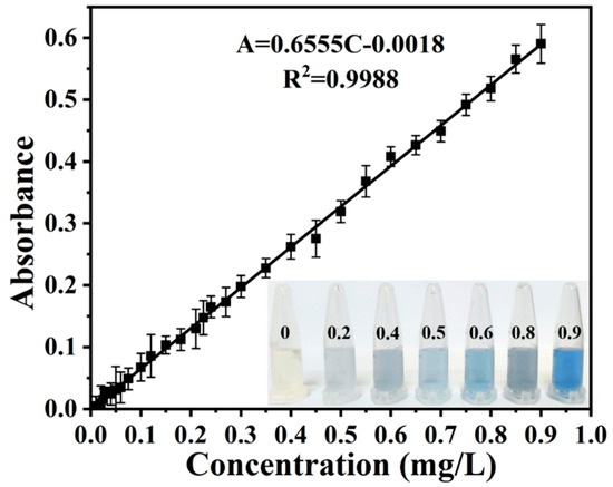 Calibration and standard curve of concentration of total phosphorus as function of absorbance; inset shows the color of the pre-validation solution samples converted with orthophosphate with different concentrations by the chromogenic reaction.