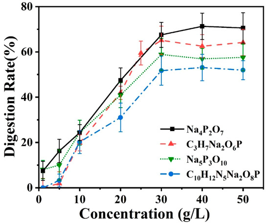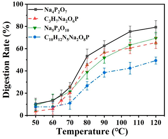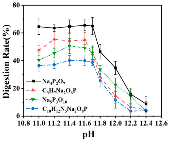 The pH value was also a key parameter to influence the digestion reaction, and the oxidant in particular presented higher oxidation activity under alkaline conditions. In the experiment, H2SO4 and NaOH were employed to adjust the pH value of the initial phosphate solution, while the temperature was set at 90 °C and the initial oxidant concentration was prepared as 50 g/L. All reagents involved were set as the same flow rates referred in Section 3.3.1. When the pH value of the reaction system was adjusted between 9–11, phosphorus existed mostly in the form of HPO42−, which easily produced more H3PO4. However, when the pH value was adjusted to larger than 11, the content of PO43− would increase in the reaction system, which was more conducive to the chromogenic reaction. Therefore, in this experiment, we adjusted the pH value of the reaction system to between 11–12.4. Each data point was repeated for three times, and the error bar represented the standard deviation of the mean. As seen from the results plotted in Figure 7, when pH values were adjusted between 11–11.7, the digestion for all four kinds of phosphates presented a constant reaction rate. However, when pH value was larger than 11.7, all the digestion rates dropped sharply, becoming lower than 10% at pH = 12.4. Tetrasodium pyrophosphate still showed the largest digestion rate in the exploration of pH value effects.