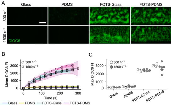 Microfluidic flow assays with polydimethylsiloxane (PDMS) microfluidic patterning. (A) Representative images of platelet accumulation on collagen peptides patterned on glass, PDMS, glass functionalized with tridecafluoro-1,1,2,2-tetrahydrooctyltrichlorosilane-glass (FOTS-glass), and PDMS functionalized with FOTS (FOTS-PDMS) after a 5 min perfusion at wall shear rates of 300 s−1 and 1500 s−1. Scale bar = 50 μm; (B) Mean Fluorescence Intensity (MFI) of platelet accumulation over time on the four surfaces. Data points are the average of n = 6, and shaded regions are the standard deviation; (C) Maximum mean fluorecence intensity of platelet accumulation over 5 min for the four surfaces.