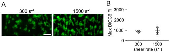 Microfluidic flow assays with microspot patterning. (A) Representative images of platelet accumulation on collagen peptides patterned on glass by microspotting after a 5 min perfusion at wall sheare rates of 300 s−1 and 1500 s−1. Scale bar = 50 µm. (B) Maximum fluorescence intensity of assays for n = 3.