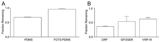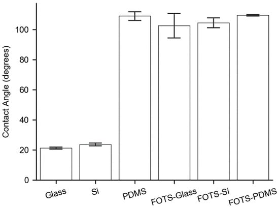 Because of the differences we observed in platelet accumulation on the different surfaces, we hypothesized that hydrophobic interactions were driving the differences in peptide adsorption on the surfaces. We measured the contact angle of glass, silicon, and PDMS on the clean surface or when functionalized with FOTS. Glass and silicon displayed low contact angles of 22°–23°, while PDMS or all of the FOTS-functionalized surfaces showed contact angles of greater than 100°. We found no significant difference between the contact angle of PDMS and any of the FOTS surfaces (Figure 3). These observations are consistent with other literature values that place the contact angle of PDMS and FOTS at approximately 110° [26,27]. These measurements suggest that hydrophobicity alone is not a sufficient explanation of the differences observed in the flow assays.