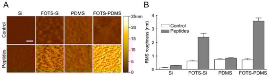 The morphology of collagen peptides on silicon and PDMS with or without FOTS treatment was measured, as described above, using atomic force microscopy (AFM) (Asylum, MFP 3D, Asylum Research, Santa Barbara, CA, USA). Collagen peptide solutions were incubated on the surfaces using the microspot patterning, as described above, or in 4 mm diameter PDMS wells. A solution containing 250 µg/mL of each peptide (CRP, GFOGER, and VWF-III) in 10 mM acetic was incubated in these wells for 2 h at room temperature in a humid environment. The wells were rinsed in triplicate using DI water, the PDMS device was removed, and the substrate was dried using an air brush. AFM images of the spots were taken using alternating current (AC) Tapping mode in air. The root mean square roughness (RMS) was calculated for each surface using Gwyddion [23].