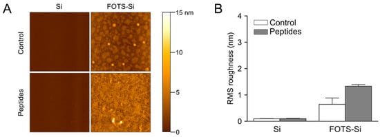 AFM of peptide adsorption by PDMS patterning. A vehicle control (acetic acid) or collagen peptide solution (250 µg/mL of CRP, GFOGER, and VWF-III each) was incubated in a PDMS well on silicon (Si) or silicon functionalized with FOTS (FOTS-Si) (A) Representative images of each surface. Scale bar = 3 µm. (B) Average RMS roughness for each surface for n = 3, error bars represent standard deviation.