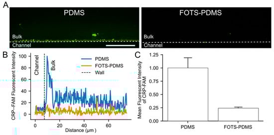 To visualize the degree of absorption of collagen peptides into PDMS, we incubated a microfluidic channel with a solution of FAM-labeled CRP (CRP-FAM) for 2 h. Penetration of the peptides into the PDMS was observed for untreated PDMS, while no penetration was observed for a FOTS-treated channel (Figure 7A). The CRP-FAM penetrated on the order of 10 µm over 2 h into the bulk of the PDMS, while no penetration was observed in FOTS-PDMS (Figure 7B). The mean fluorescence intensity of CRP-FAM showed a four-fold higher intensity on PDMS compared to FOTS-PDMS (Figure 7C). These results show direct evidence of peptides absorbing into untreated PDMS but not FOTS-PDMS in support of the depletion of peptides in PDMS devices (Figure 6).