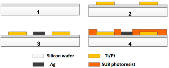 Considering the good electrical and temperature characteristics, we chose Pt as the substrate metal of the multi-sensor integrated chip [12]. We used 4-inch silicon wafer processing technology and basic MEMS technology to fabricate the structure of each part of the microchip. The simplified fabrication process [12] is shown in Figure 1.