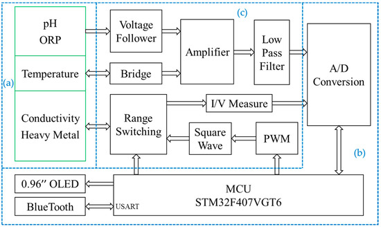 The control module adopts a piece of STM32F407VGT6 chip (STMicroelectronics, Geneva, Switzerland) as the main controller and contains the smallest system composed of the external crystal oscillator, debugging interface, reset circuit and so on. The human-computer interaction module consists of a 0.96-inch OLED screen, a Bluetooth unit (BLE103 chip, Wenheng Technology, Shanghai, China) [28] and a serial communication port of USART. The OLED screen can display real-time data, which is used to prompt the running state of the system and display the measurement results directly. By using Bluetooth communication, we can connect the portable water quality detection system with a smartphone to achieve functional control, data transmission, and analysis. In order to store large amounts of data locally, we use the USART port to transmit data to the computer. Data processing and result curve drawing are performed by the Origin software (Version 9.6.5, OriginLab, Northampton, MA, USA). A low power analog-to-digital converter (ADC) chip AD7790 (Analog Devices, Norwood, MA, USA) is used in the measurement. Under the reference voltage of 2.5 V, it can obtain the smallest measurement of 0.0763 mV [29]. When the pH sensor acts as −59.14 mV/pH, the smallest theoretical change for pH we can detect is 0.0763/59.14 = 0.0013 pH. In the detection system, only two decimal places are retained to achieve a resolution of 0.01 pH.