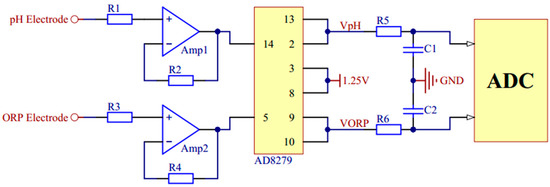The signal conditioning circuit mainly includes filters, operational amplifiers, and the signal generator circuit. For the OCP measurement of pH and ORP, an AD8279 chip (Analog Devices, Norwood, MA, USA) is used to amplify or reduce their voltage by two times. Then it adds the compensation voltage of 1.25 V to get the measurement voltage in 0–2.5 V. Considering impedance matching, two voltage followers are used. The signal conditioning circuit of pH and ORP is shown in Figure 4. The RE of them is connected to a zero potential of GND through a resistor.