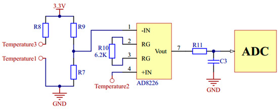 For temperature measurement, the Wheatstone bridge is used to convert the change of resistance value to voltage change. The voltage is amplified by using a single resistance amplifier AD8226 (Analog Devices, Norwood, MA, USA). The signal conditioning circuit of temperature is shown in Figure 5.