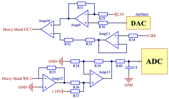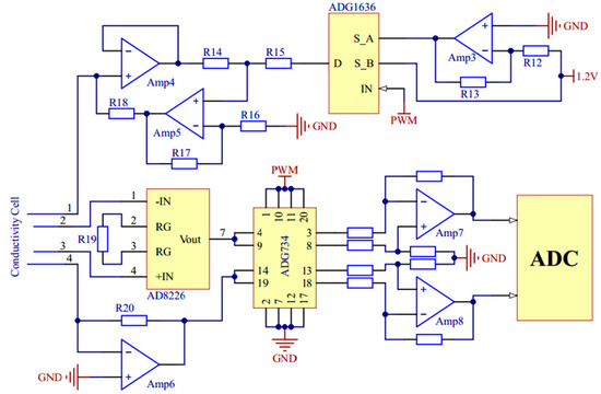 In the measurements of conductivity and copper irons, voltage excitation of specific frequency and amplitude is needed. A pulse width modulation circuit and a digital-to-analog converter (DAC) chip AD5662 (Analog Devices, Norwood, MA, USA) are used respectively to generate bipolar square wave and variable pulse voltage. The signal conditioning circuits of conductivity and copper irons are shown in Figure 6 and Figure 7.