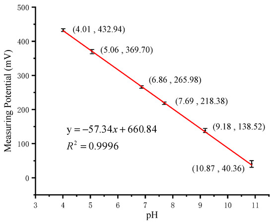 Six standard solutions were prepared for pH measurement in the range of 4–11. The standard solutions consisted of 0.2M NaOH in different volumes added to the Britton Robinson buffer [12]. To ensure the correct configuration of the standard solutions, a pH meter (PHS-3C, INESA Scientific Instrument, Shanghai, China) with a glass electrode (E-201-9, Ruosull Technology, Shanghai, China) was used to measure the pH. The results were used as the x-axis data of the calibration curve. The calibration measurement started with the minimum standard solution (pH = 4.01) and increased. The time for the system to stabilize in each solution was within 30 s. Three repeated tests from 4.01 to 10.87 were carried out on our portable detection system. The calibration curve results are shown in Figure 11. The sensor shows a super-Nernst response of pH and has a sensitivity of −57.34 mV/pH, which is close to the theoretical value −59.14 mV/pH in Equation (4). The previously reported sensitivity −62.88 mV/pH of this kind of sensor was detected by an electrochemical workstation of GAMRY Reference 600 [12]. The result shows that our portable detection system has satisfactory detection capabilities. In the calibration curve, the span is calculated as 10.87−4.01=6.86. The maximum absolute error of pH measurement is 0.07 when pH = 9.18. The accuracy is computed as 0.07/6.86=1.02%.