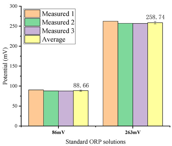 Two standard solutions of 86 mV (quinhydrone solution with pH = 7) and 263 mV (quinhydrone solution with pH = 4) were used for ORP measurements. The RE was the Ag/AgCl glass electrode. The average values obtained by three measurements are 88.66 mV and 258.74 mV respectively as shown in Figure 13. The relative error in the detection of the ORP sensor is less than 3%, which shows good precision and repeatability. Commercial ORP instruments typically use one-point calibration as standardization [32,33]. The standard solution can be a Light’s solution (476 mV) or a ZoBell’s solution (229 mV) [32].