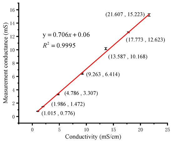 A bipolar square wave at 10 kHz frequency was selected to excite the four-electrode ring conductivity sensor in our detection system. The sensor was calibrated with 7 standard solutions in the range of 1–22 mS/cm. These standard solutions were pure NaCl solutions with different mass percentage concentrations of 0.05, 0.10, 0.25, 0.50, 0.75, 1.00 and 1.24, respectively. At constant temperature, the fixed mass fraction solution has fixed conductivity [34]. A commercial portable conductivity meter (8306, AZ Instrument, Taichung, China) was used to measure the conductivity of these standard solutions at room temperature. The calibration curve of conductivity detection is shown in Figure 14. The electrode constant of the conductivity sensor is calculated as 1/0.706=1.416 cm−1 from the three sets of volt-ampere characteristic data obtained by the portable meter. The experimental result shows that the four-electrode conductivity sensor has good linearity and sensitivity. When measuring unknown solutions, we first use the system to measure conductance and temperature values. Then the point of the conductance is substituted into the calibration curve in the detection program, and the conductivity of the solution is calculated using Equation (6). The measuring range of conductivity is 1.015–21.607 mS/cm. The maximum absolute error is 0.730 mS/cm, which includes calculation errors. The accuracy is computed as 0.730/(21.607−1.015)=3.55%.