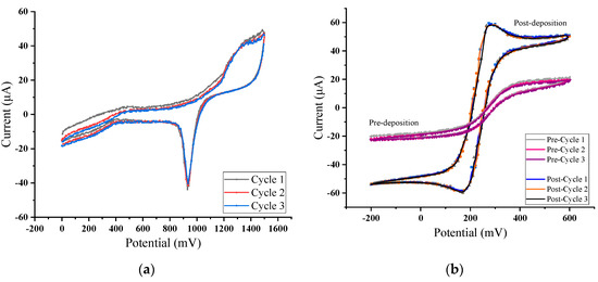 Cyclic voltammetry (CV) characteristic curves in: (a) H2SO4; (b) K3[Fe(CN)6].