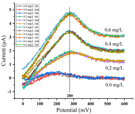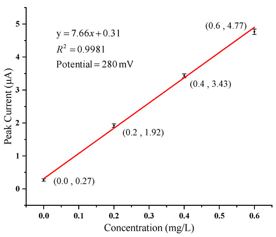 The response curves of the sensor system to different concentrations of copper ion solutions are shown in Figure 16, in which only the current response ranging from 0–600 mV is shown. The order from bottom to top is 0.0, 0.2, 0.4, 0.6 mg/L. The peak potential of copper ion dissolution is 280 mV when the working electrode is a platinum interdigital electrode modified with AuNPs. The average value of each concentration is taken as the final peak current value at least three times after detection. The relationship between concentration and peak current is recorded and linear fitting is made as shown in Figure 17. The linearity for fitting a straight line is 0.9981.