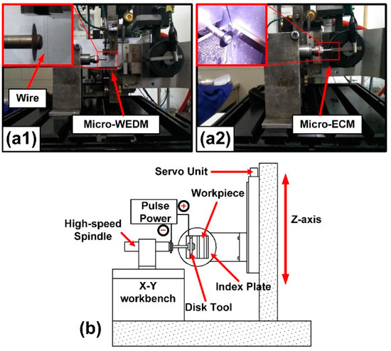 (a1,a2) Photographs of the micro wire electrical discharge machining (micro-WEDM) machine with high precision micro-electrochemical milling device. (b) The device diagram of the micro-electrochemical milling module.