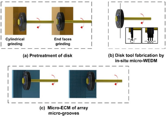The schematic illustration of this array micro-grooves process is shown in Figure 2. The main procedure includes: (1) pretreatment of disk; (2) disk electrode fabrication by in-situ micro-WEDM; (3) micro-electrochemical milling of array micro-grooves.