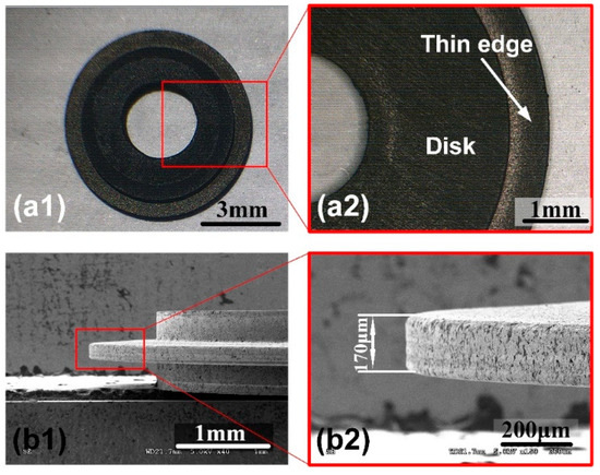 Digital photographs and SEM images of the graphite tool electrode prepared by micro-WEDM with disk high-speed rotation. (a1,a2) are photograph of the graphite tool electrode and the enlarged view. (b1,b2) are SEM images of the thin edge of the electrode and the enlarged view.