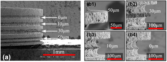 SEM images of the graphite disk electrode by micro-WEDM with the thickness of 10 μm, 30 μm, 50 μm and no offset distance (0 μm). (a) SEM image of the as-prepared graphite disk electrode. (b1–b4) The enlarged view of the thin edges with different width.