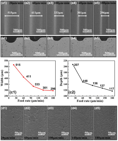 (a1–a5) SEM images of the morphology on micro-grooves under the feed rates of 20 μm/min, 60 μm/min, 100 μm/min, 140 μm/min and 180 μm/min. (b1–b5) The cross-profiles of the micro-grooves under corresponding feed rates. (c1,c2) The width and depth of the micro-grooves changing curves with feed rates. (d1–d5) The surface quality of the micro-grooves under corresponding feed rates.