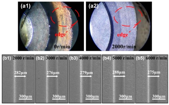 (a1,a2) Photographs of thin edge surfaces after ECM milling for 30 min with the rotate speed of 0 r/min and 2000 r/min under optical microscope. (b1–b5) SEM images of micro-grooves under the disk electrode rotate speed of 2000 r/min, 3000 r/min, 4000 r/min,5000 r/min and 6000 r/min.