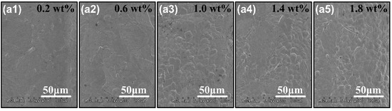 SEM images of the surface quality on the bottom of the micro-grooves with the electrolyte concentrations of (a1) 0.2 wt%, (a2) 0.6 wt%, (a3) 1.0 wt%, (a4) 1.4 wt% and (a5) 1.8 wt% accordingly.