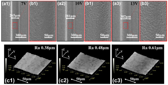 (a1–a3) SEM images of the micro-groove profiles with the voltage of 7 V, 10 V and 13 V. (b1–b3) SEM images of the surface quality with corresponding voltage. (c1–c3) 3D morphologies of the bottom surfaces of the micro-grooves.
