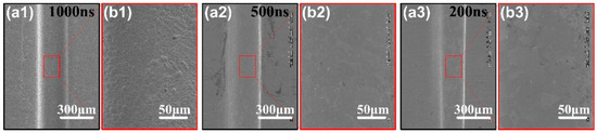 (a1–a3) SEM images of the micro-groove profiles with the pulse width of 200 ns, 500 ns and 1000 ns. (b1–b3) SEM images of the surface quality with corresponding pulse width.