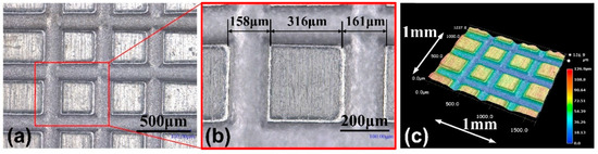 Figure 13 is the array micro-grooves prepared by multi-edges disk electrode with edge width of 90 μm. The multi-edges disk electrode makes micro-grooves first along X-axis, then turning the workpiece by 90°, continue ECM process. Figure 13b is the local enlargement. The width of the left groove is 158 μm, and the right one is 161 μm. Since the high-speed flushing is by single needle, it is difficult to ensure the same flushing condition on each groove. The array micro-structures may collapse in the corners. Figure 13c is the 3D morphology, the depths of the groove are similar. When the edge width is 90 μm, the dimensional uniformity deviation is 1.89%, and the shape accuracy of the square is high. Multi-needles could adopt in the device for better flushing to improve machining quality. The as-prepared array micro-grooves indicate that the method of micro-electrochemical milling based on disk tool electrode in-situ micro-WEDM making have an excellent application prospect.