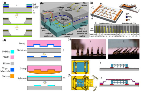 (a) Illustration of the typical fabrication of the MEMS sensor using bulk etching technology. (b) 3D view of a package with a wire bonding and a sealing technology. Adapted with permission from Torunbalci et al. []. (c) Schematics of a bandwidth tunable MEMS metamaterial supercell of microcantilever resonators with varying fixed and released lengths. Adapted with permission from Shih et al. []. (d) Schematic illustration of the two major methods involved in soft lithography. (e) A bendable microneedle array with a sharp tip and a lateral force was applied onto microneedle array. Adapted with permission from Wang et al. []. (f) Multi-layer MEMS structure was designed using direct laser writing technology, and the positioning and deposition processes were repeated. Adapted with permission from Reeves et al. [].