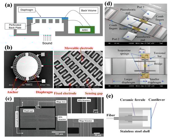 (a) Schematic of conventional capacitive MEMS microphone. (b) A no-back-plate capacitive microphone with interdigitated electrodes (IDTs) structure. Adapted with permission from Lo et al. []. (c) Bio-inspired piezoelectric microphone with a rectangular and a circular diaphragm. Adapted with permission from Rahaman et al. []. (d) Hybrid-mode microphone with a piezoelectric and a capacitive mechanism. Adapted with permission from Zhang et al. []. (e) Schematics of two optical microphones. Adapted with permission from Chen et al. [].