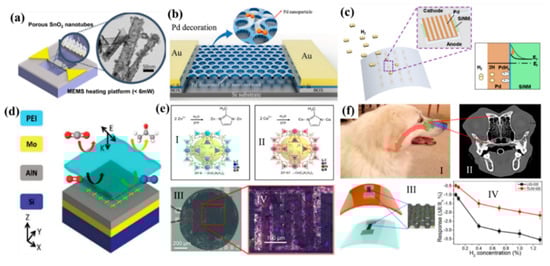 (a) Scheme of a localization synthesis of ZnO nanowire and SnO2 on the MEMS microheater. Adapted with permission from Cho et al. []. (b) Schematic of the Pd-decorated Si nanomesh H2 sensor. Adapted with permission from Gao et al. []. (c) Graphical illustrations of a flexible Pd/Si nanomembrane gas sensor, and an energy band diagram demonstrating the H2 sensing mechanism with the Schottky barrier. Adapted with permission from Cho et al. []. (d) Complementary metal-oxide-semiconductor (CMOS) platform for CO2 sensing in mid-IR. Adapted with permission from Hasa et al. []. (e) Image of the deposition of zeolitic imidazolate framework (ZIF)-8 nanocrystals solution by a drop coating. Adapted with permission from Matatagui et al. []. (f) Biomimic laser-induced graphene (LIG) gas sensor. Adapted with permission from Zhu et al. [].