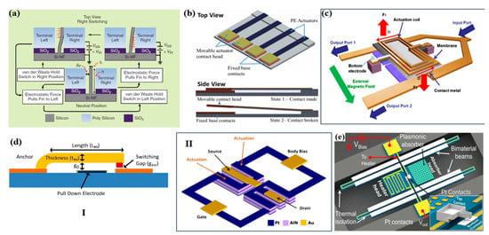 (a) Schematics of the switching behavior of the Si fin. Van der Waals force will hold the fin in contact position even after the electrostatic force. Adapted with permission from Soon et al. []. (b) Structure of the piezoelectric actuators array and the two states of switching. Adapted with permission from Maharjan et al. []. (c) Schematic diagram of the proposed push-pull radio frequency (RF) MEMS switch. Adapted with permission from Cho et al. []. (d) Schematic representation of the piezoelectric mechanical transistor, showing the three-finger dual-beam design. Adapted with permission from Sinha et al. []. (e) Structure of the plasmonically-enhanced micromechanical photoswitches (PMP) and working principle with scanning electron microscope images with highlighted magnified views of the plasmonic absorber. Adapted with permission from Rajaram et al. [].