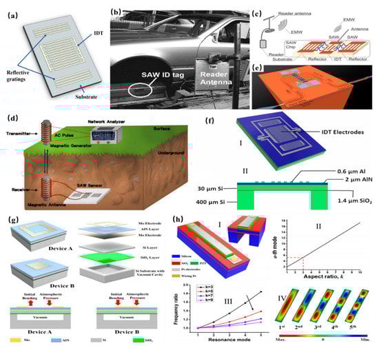 (a) A typical structure of a surface acoustic wave (SAW). (b) SAW ID tag application in a car assembly line. Adapted with permission from Plessky et al. []. (c) A wireless temperature monitoring system. Adapted with permission from Ma et al. []. (d) Wireless underground temperature sensor system with SAW. Adapted with permission from Kim et al. []. (e) Acoustically driven wavelength-division multiplexers using SAW. Adapted with permission from Crespo-Poveda et al. []. (f) Lamb wave sensor to decouple the viscosity and density of the liquid. Adapted with permission from Wang et al. []. (g) High-performance piezoelectric micromachined ultrasonic transducer (PMUT) with a zero-bending membrane. Adapted with permission from Wang et al. []. (h) Broadband PMUT based on a mode-merging. Adapted with permission from Wang et al. [].