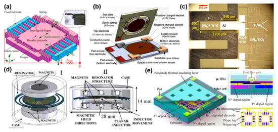 (a) The schematic of an electrostatic energy harvester. Adapted with permission from Lu et al. []. (b) An electret energy harvester. Adapted with permission from Tao et al. []. (c) The SEM with a false-color of a piezoelectric energy harvester. Adapted with permission from Toprak et al. []. (d) The schematic of an electromagnetic energy harvester. Adapted with permission from Sardini et al. []. (e) Hybrid energy harvester with the piezoelectric and electromagnetic mechanism. Adapted with permission from Yan et al. [].