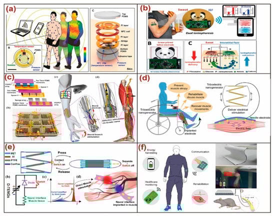 (a) A battery-free wireless pressure and temperature dual sensors. Adapted with permission from Han et al. []. (b) A wearable biosensor for simultaneously monitoring sweat and interstitial fluid. Adapted with permission from Kim et al. []. (c) A triboelectric nanogenerator (TENG)-based neuromodulator for peripheral nerve stimulation. Adapted with permission from Lee et al. []. (d) A self-powered TENG system for direct muscle stimulation. Adapted with permission from Wang et al. []. (e) A diode-amplified TENG for high-efficiency muscle stimulation. Adapted with permission from Wang et al. []. (f) A current-enhanced TENG textile system for healthcare monitoring and rehabilitation applications. Adapted with permission from He et al. [].