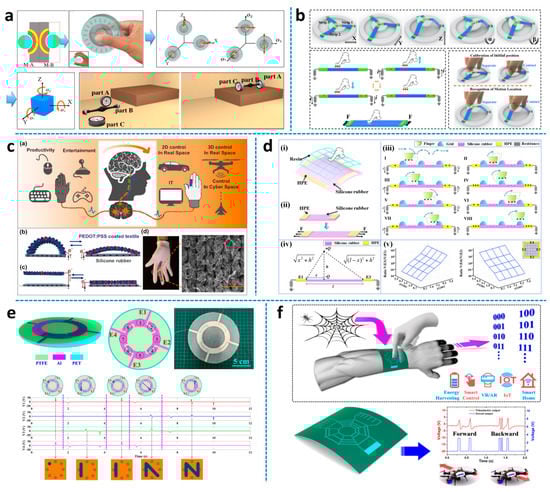 Triboelectric nanogenerator based human-machine interfaces. (a) Self-powered triboelectric based 3D-control sensor. Adapted with permission from Chen et al. []. (b) Multi-dimensional nano-manipulation terminal using strip sensors. Adapted with permission from Chen et al. []. (c) Conductive textile-based glove interface. Adapted with permission from He et al. []. (d) Flexible wearable patch for robotics manipulation. Adapted with permission from Chen et al. []. (e) Multi-functional and minimalist interface using a flexible wearable triboelectric patch. Adapted with permission from Shi et al. []. (f) Single-electrode bio-inspired spider-net-coding interface. Adapted with permission from Shi et al. [].