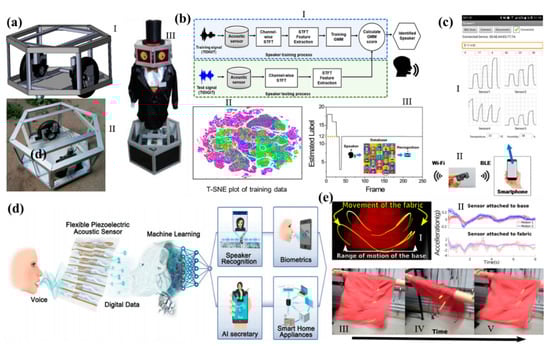 Around the big data and supersensitive sensing, MEMS/NEMS sensor using machine learning promotes the development trend of the next generation intelligence system []. For example, an impressive AI concept sensor (called AIfES) with a completely configurable artificial neural network was developed. This sensor-related AI system can recognize handwriting and gestures, which successfully demonstrated the application of the next-generation sensors. Nevlydov et al. developed a robot using machine-learning methods as shown in Figure 12a []. They successfully adopted a three-axis MEMS gyroscope fixed to the robot body using various machine-learning methods for solving classification tasks. To enhance the vibration energy harvesting at low frequency, Nabavi et al. reported a piezoelectric MEMS vibration energy harvester at low (less than 200 Hz) resonant frequency based on the deep neural network []. This trained network integrated with the genetic algorithm to optimize the geometry of the energy harvester with the accuracy of the network in prediction above 90%. As to the area of gas sensing prediction, Esposito et al. introduced the dynamic neural network (DNN) method in a stochastic prediction of air pollutant concentrations to the chemical multisensory []. When it came to sound detection, Han et al. reported a platform using a machine learning-assist method for speaker recognition as shown in Figure 12b []. They claimed that the Gaussian Mixture Model (GMM) method in machine learning can reach up to an outstanding speaker recognition rate of 97.5% compared to the reference MEMS microphone. Furthermore, Suh et al. reported a fully integrated and portable semiconductor-type multi-gas sensing module for IoTs applications as shown in Figure 12c []. The module’s multiple gas sensing capability enabled selectivity enhancement by principal component analysis (PCA) method. The fabricated sensors showed decent response and recovery to the frequent heater on/off repetition for both portable and stationary applications. Furthermore, Jung et al. reported flexible piezoelectric acoustic sensors and machine learning for speech processing as shown in Figure 12d []. They claimed that smart sensors can provide personalized services. They further predicted the development trends using flexible sensors around flexible piezoelectric materials, machine learning algorithms, and speaker recognition. As to the more complex objects, Figure 12e reports wearable sensors on loose cloth [,]. They claimed that the multi-sensors mounted onto fabric showing significant differences than onto the rigid substrate. It predicted that a trade-off between additional information and intense motion can provide better accuracy than the conventional method for signal acquisition.