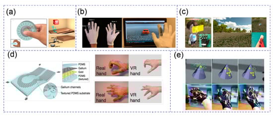 (a) A self-powered triboelectric based virtual reality (VR) 3D-control sensor. Adapted with permission from Chen et al. []. (b) A self-powered glove-based intuitive interface for diversified control applications in real/cyberspace. Adapted with permission from He et al. []. (c) A stretchable and transparent tactile sensor based on a hetero-contact microstructure for virtual human control. Adapted with permission from Liao et al. []. (d) Gallium-based thin films for wearable human motion sensors. Adapted with permission from Dejace et al. []. (e) A vibrotactile glove for identifying virtual 3D geometric shapes. Adapted with permission from Martinez et al. [].