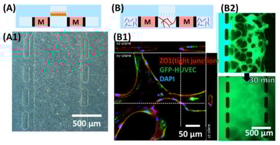 Demonstration of individual culturing chambers. (A) Culturing the human retinal pigmental epithelial cell (ARPE-19) monolayer in the upper channel. (A1) Microscopic view focusing on the upper channel, showing monolayer of ARPE. (B) Formation of microvascular lumens in the lower channels. “M” (medium channels) corresponded to * (lower channel) in Figure 1A. (B1) Confocal microscopic image staining for zonula occludens-1 (ZO1) and 4′,6-diamidino-2-phenylindole (DAPI). (B2) Snapshots taken after loading 70 kDa of FITC-dextran into one side of the lower channel immediately (top) and 30 min after (bottom).