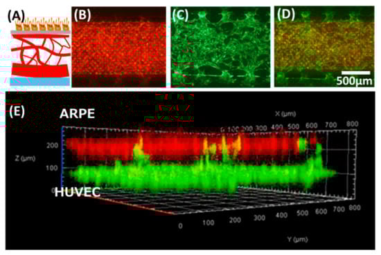 The oBRB model prototype built using the proposed device. (A) Schematic showing the anatomical structure of oBRB (retinal pigment epithelial cells–Bruch membrane-choroids). (B–E) tri-culture of ARPE–human umbilical vein endothelial cells (HUVEC)-human lung fibroblasts (NHLF). (B) ARPE cells stained in red were cultured in the upper channel. (C) GFP-HUVEC microvessels were cultured in the lower channel. (D) Overlay of (B) and (C). (E) Confocal microscopic view of the cross-section of the co-culture model.
