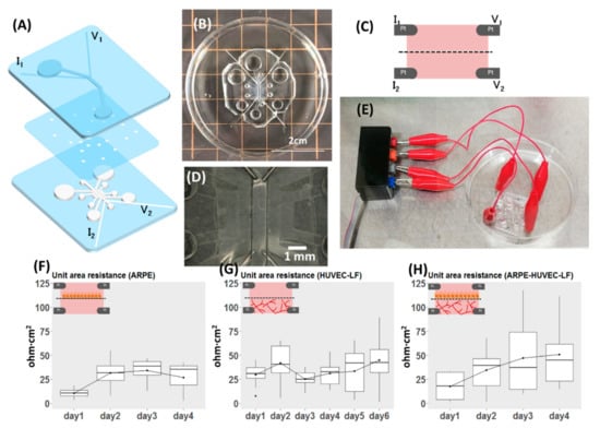 Based on the pre-established design of a multichannel microfluidic device, we modified the device based on the Jeon research group [] and the Kamm research group [] into top-down, direct-contact cell–cell or cell–vascular co-culturing (Figure 1). Using the device, we built a model of the outer blood–retina barrier (oBRB), mimicking the in vivo retinal pigment epithelial cells-Bruch membrane-fenestrated choroids using human retinal pigmental epithelial cells (ARPE-19) and human umbilical vein endothelial cells (HUVEC). To demonstrate the versatility of the device, we slightly modified the design by embedding four Platinum electrodes (diameter 300 µm) for trans-epithelial electrical resistance (TEER) measurement. Using the modified device, we quantified the TEER of ARPE monolayers and the oBRB model. The device proposed in this study can be used as a multi-culturing cell and/or vessel model for various applications with the potential of connecting individual fluidic devices in a fluidic network, mimicking human physiology as demonstrated in the work of Edington et al. [].