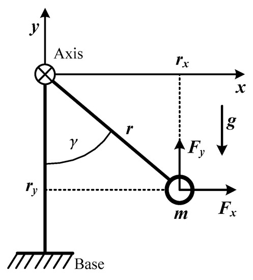 In order to further understand the principle and dynamic behaviour of this harvester, the configuration depicted in Figure 2 was studied. A point mass m at a distance r from its axis of rotation was considered under gravity and external excitation. The motion equation of the rotating mass was as shown in Equation (1) [25].