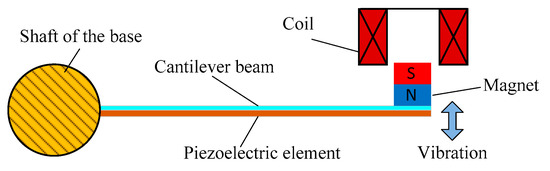 The structure diagram of a single piezoelectric electromagnetic coupling cantilever beam is shown in Figure 3. The surface of the cantilever beam was pasted with MFC piezoelectric element and the free end of the cantilever beam is provided with permanent magnet and coil. When the cantilever beam vibrates under external excitation, the MFC piezoelectric element will output alternating voltage because of alternating stress and the closed coil will also produce alternating current because of the change of magnetic flux. The former is based on the positive piezoelectric effect and the latter is based on Faraday’s electromagnetic induction law. U is the vibration displacement of cantilever beam. The piezoelectric electromagnetic coupling vibration energy harvester proposed in this paper improves the harvesting efficiency by integrating the two electromechanical conversion mechanisms to a cantilever beam structure.