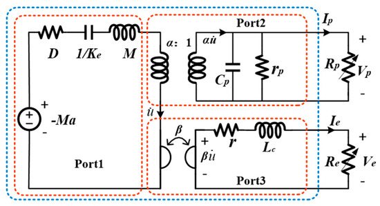 Equivalent circuit model of a single piezoelectric electromagnetic coupling cantilever beam. Port1: mechanical domain, Port2: piezoelectric unit, Port3: electromagnetic unit.