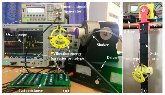 The first was a single dimension vibration test platform, as shown in Figure 5a, which was composed of a shaker (ZJ-2A, Shanghai Zhurui CO., Shanghai, China), a driver (GF-20W, Shanghai Zhurui CO., Shanghai, China) and a function signal generator (DG3121A, RIGOL CO., Beijing, China). It can simulate a single dimension excitation vibration. Different vibration conditions can be simulated by controlling its vibration amplitude and frequency. By changing different frequency and amplitude, the motion state of the energy harvester under different excitation conditions was obtained and the results under different experimental conditions were obtained.
